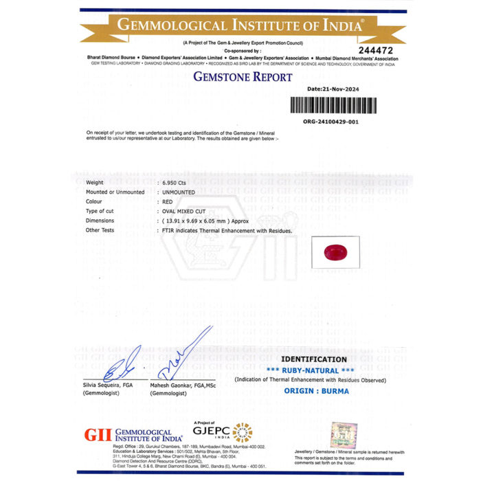 | WEIGHT | 6.95 CARAT |